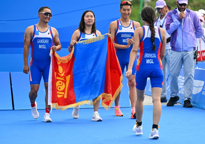 队友也会在困难时支持你渡过难关。铁人三项混合接力赛中,当年仅18岁的蒙古国选手作为全场最后一名抵达终点时,其他三位队友手拿国旗,微笑鼓掌,上前相迎。
