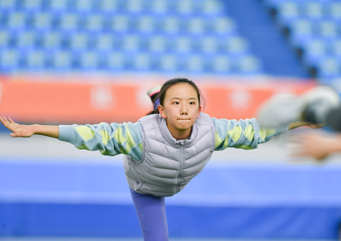 ↑2023年1月29日,15岁的景上清在新疆冬季运动管理中心参加花滑冬令营。
