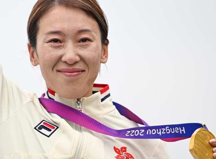 ↑2023年10月4日,中国香港选手杨倩玉在女子公路赛颁奖仪式上举起金牌,眼角含泪。