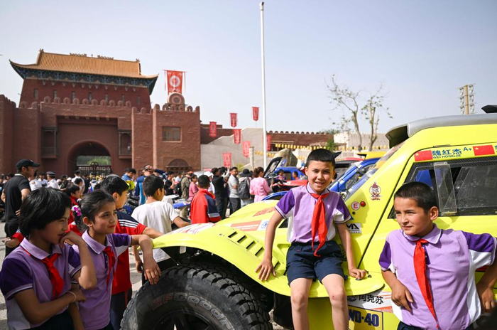 ↑2023年6月1日,新疆和田地区的小学生在景区参观环塔拉力赛赛车。