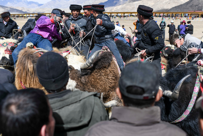 ↑2023年3月22日,比江·比格瓦孜和村民们进行牦牛叼羊比赛。