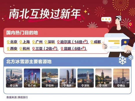 哈尔滨的雪花、上海的繁花,给2024年旅游行业带来开门红,也反映“南北居民互换过年”的趋势。携程数据显示,春节期间,国内热门目的地前10名为北京、上海、广州、深圳、哈尔滨、成都、西安、杭州、三亚、昆明。