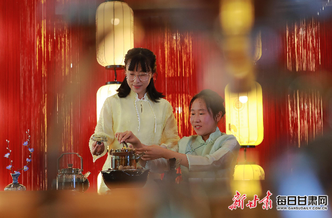 金塔汽车维修中等专业学校“金色胡杨梦工厂”的茶道茶艺坊,指导教师高颖洁(左一)正在配合学生杨婷冲泡当地人喜爱的“罐罐茶”。