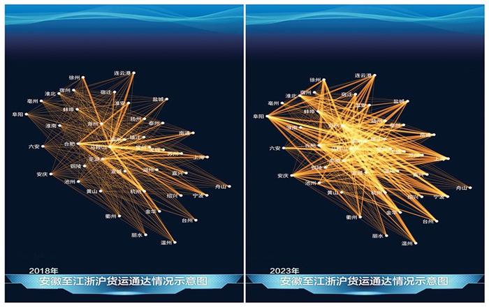 融合发展,交通先行。不断完善的交通网络,成为长三角经济社会发展的“助推器”,以轨道交通为骨干的一体化综合交通网络初步成型。图为2018年、2023年安徽至江浙沪货运通达情况示意图。2023年与2018年相比,安徽发送至江浙沪的货运量显著增长,长三角物流更为密集。 新华社发(新华社卫星新闻实验室供图)