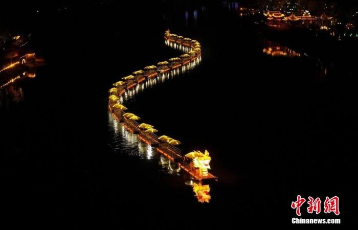 资料图:一条200米长的水上金龙在安徽省黄山市休宁县齐云山镇横江江面上游弋而过,龙灯迤逦,与江畔的古民居夜色相映成辉,喜迎新春。施亚磊 摄
