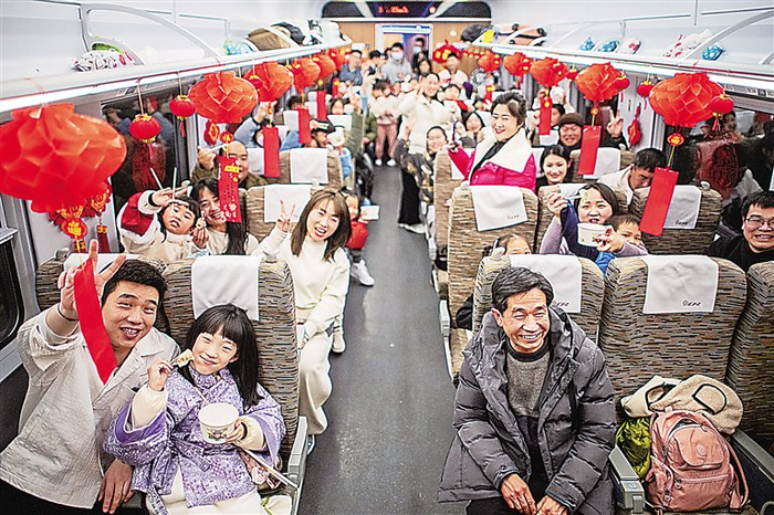 2月9日,在D38次列车上,武汉客运段汉口城际动车组车间“凤舞楚天”乘务组为乘客发放饺子,大家一起吃饺子过除夕。 新华社发