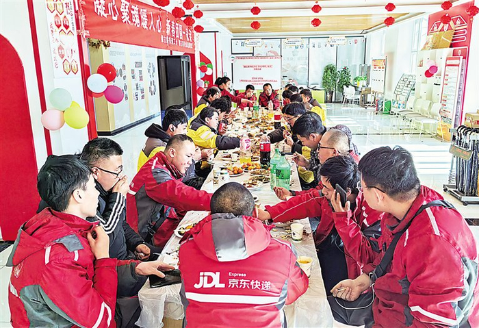 2月9日,银川市兴庆区银古路街道康园社区党委、工会联合银古路街道工会开展“凝心聚力暖人心 新春团圆一家亲”主题活动,邀请辖区50名快递小哥、外卖骑手一起吃团圆饭。 宁夏日报报业集团全媒体记者 高晓刚 摄