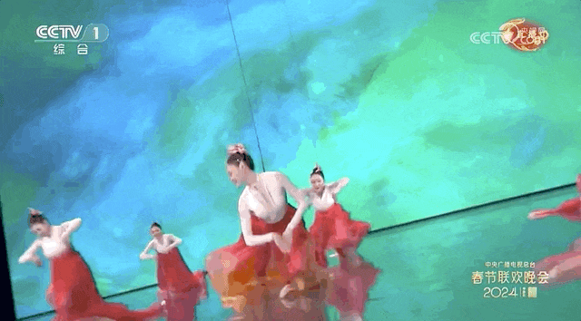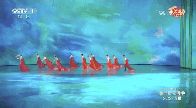 舞台选择了油画质感的大屏,背景的蓝绿色系和演员裙摆的红白色产生撞色效果。