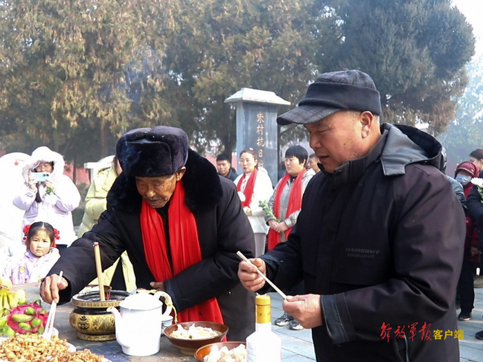 这天清晨,朱村的百姓纷纷走出家门,冒着严寒,将一碗碗刚出锅的饺子敬献在抗日战斗纪念碑前。与此同时,第82集团军某旅“钢八连”官兵在荣誉室内整齐列队,与朱村村民通过视频连线,同步开展纪念活动。