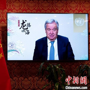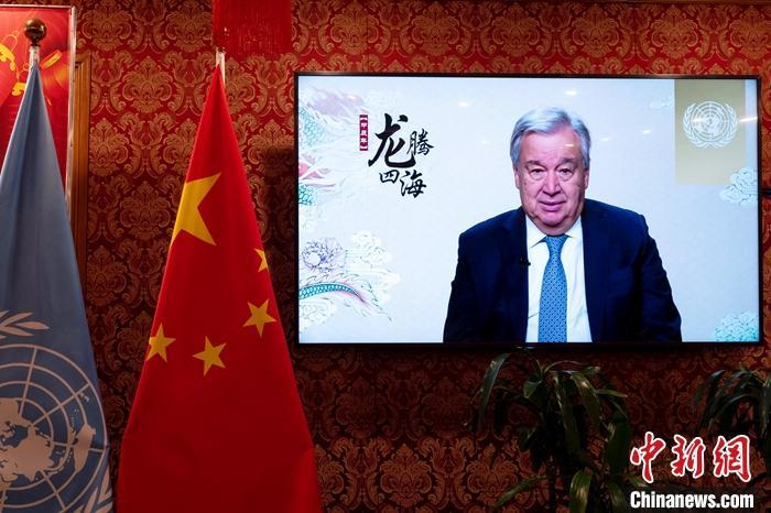 当地时间2月6日,联合国秘书长古特雷斯通过视频发表新春致辞,向中国人民和全球华人致以农历甲辰龙年的祝福和问候。图为中国常驻联合国代表团纽约驻地的屏幕播放致辞。 中新社记者 王帆 摄