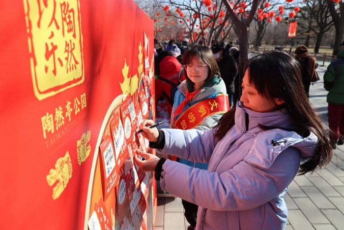 玉渊潭公园在樱花商店前开展新春拜年主题活动。公园职工为市民游客送福字、送福袋、送挂件。游客们写下对未来的期许,一个个祈福标签贴满心愿墙。科普广场上,“好运投壶”“趣味射箭”“以诗会友”“龙年心愿圈”等传统民俗活动,以及“创意脸谱体验”“喜气洋洋花福桶”等传统年味趣味游戏受到热捧,游客们驻足参与,乐享其中。