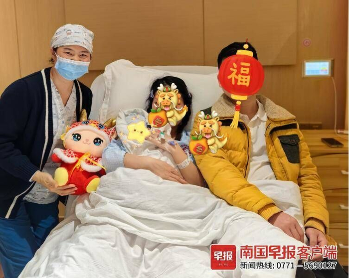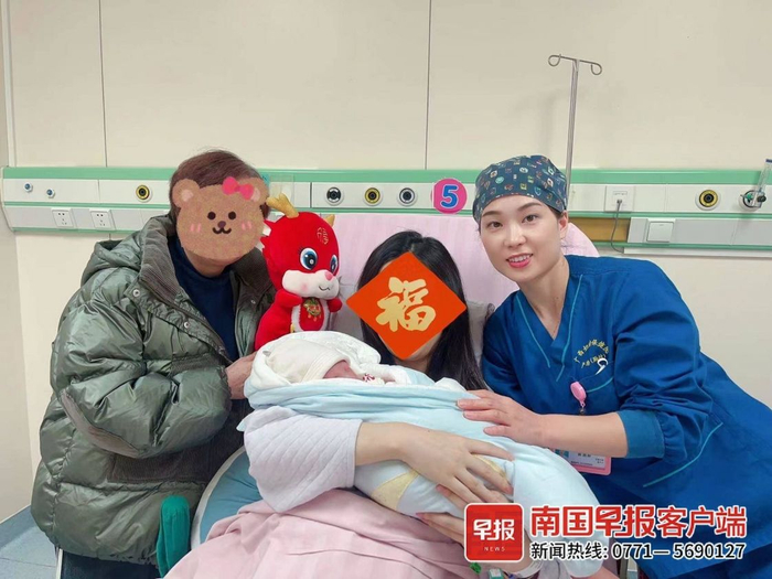 2月10日零时55分,南宁市妇幼保健院迎来首个龙宝宝。妈妈姓程,因为破水入院,顺产生下了一个体重3900克的健康男宝宝。家长为孩子取了个小名叫糖果,因为爸爸姓唐,孕期妈妈喜欢吃糖,生下宝宝之后,产妇不顾疲惫,对医护人员说:“感谢你们陪着我,过年值班,你们辛苦了。”