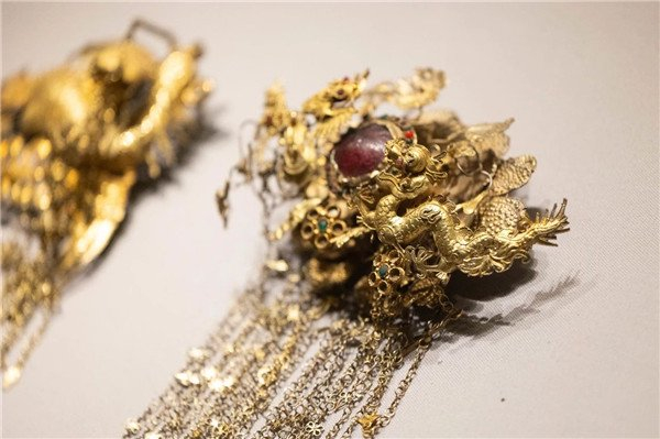 这件傣族头饰呈“二龙戏珠”造型,另有花瓣、鱼等具有吉祥寓意的装饰;龙眼、龙身等部位镶嵌了几十枚精巧的红蓝小料珠,其下扣有链坠,生动而富有灵气,展现了傣族手艺人高超的技艺。
