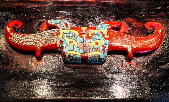 虽然几千年过去了,但碧绿的松石与黄色的金箔依然熠熠生辉,凸显出龙的尊贵、威仪。
