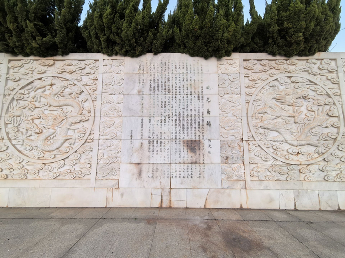 这可把渔民急坏了。如何才能救下天龙?渔民们受人点拨,一起挖了一个龙潭,把这截木头藏在潭底。经过休养生息,天龙恢复了龙身,一如既往照顾着岛上的村民。为了纪念天龙,人们就把这个无名小岛起名为藏龙岛。而这段佳话就刻录在藏龙大道巨龙雕塑旁边的石壁上。这也大概是巨龙雕塑只有龙头露出水面,龙身却藏在水里的原因。