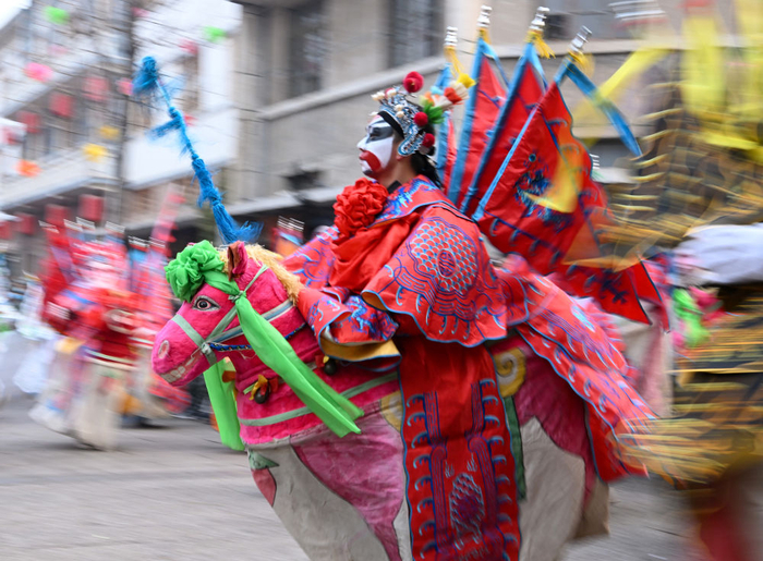 2012年春节假期期间,宁夏回族自治区海原县三河镇的社火队在进行春节社火表演。