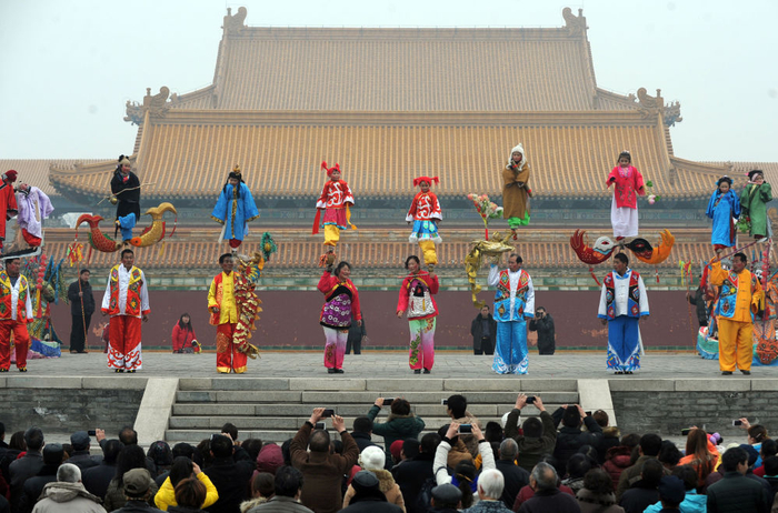 2014年春节前,甘肃临夏回族自治州永靖县盐锅峡镇的村民在排练传统社火节目,喜迎新春佳节。