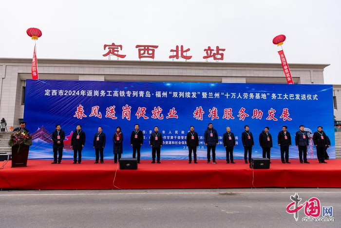 2月19日上午,定西市2024年返岗务工高铁专列青岛·福州“双列续发”暨兰州“十万人劳务基地”务工大巴发送仪式在定西北站广场举行。中国网记者 郑亮摄