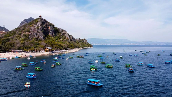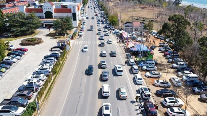 在月亮湾湿地公园、抚海湾、禄充等景区,到处车水马龙,游人如织,大家沿湖散步、拍照打卡,欣赏着抚仙湖旖旎风光。
