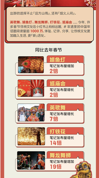 其中,大量传统非遗活动在小红书上出圈。《报告》显示,嬉鱼灯笔记发布量增加2倍,逛庙会笔记发布量增长2倍,英歌舞笔记发布量增长7倍,打铁花笔记发布量增长14倍,舞龙舞狮笔记发布量增加19倍。