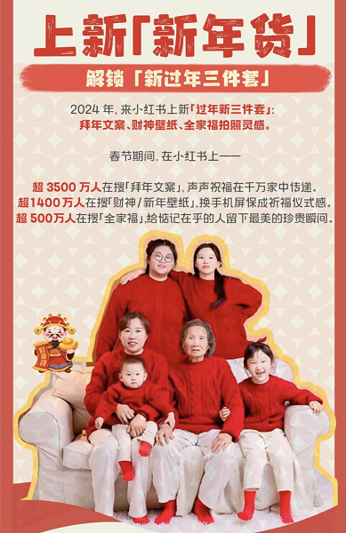 《报告》显示,今年春节,拜年文案、财神壁纸、全家福拍照灵感成为了备受欢迎的“新过年三件套”。超过3500万人在小红书搜“拜年文案”,送出自己真挚的祝福;接近1500万人在小红书搜“财神壁纸”,换手机屏保,满足祈福仪式感;搜“全家福”的人数超过500万人,一家人聚在一起,让全家福拍得更有仪式感。