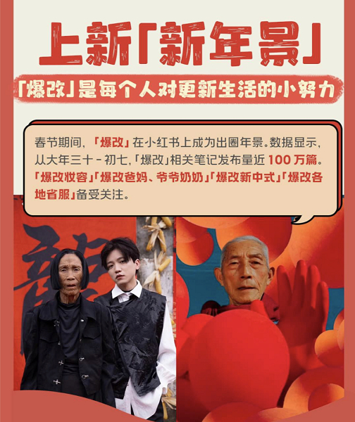 春节期间,“爆改”在小红书上成为出圈“新年景”。数据显示,从大年三十到初七,“爆改”相关笔记发布量近100万篇,“爆改妆容”“爆改爸妈、爷爷奶奶”“爆改新中式”“爆改各地省服”关注度居高不下,作品也层出不穷。