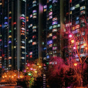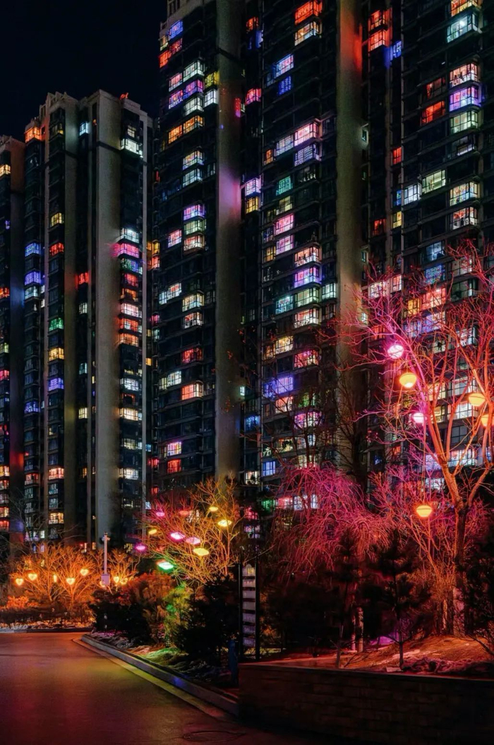 更教人惊叹的是,大家不约而同在春节期间的夜里亮起彩灯,成百上千户在一起颇具规模,酷炫的彩灯颇具未来感和科技感,给人一种置身未来城市的错觉。