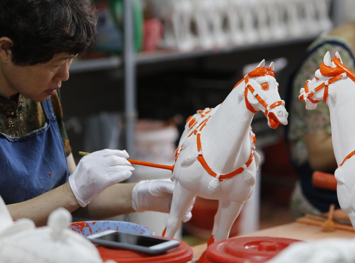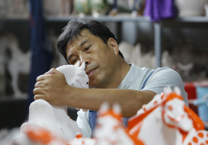 我与同事在村里的一家唐三彩生产企业门口等了一会儿,才见到了匆匆走出生产车间的高顺旺,彼时他刚检查完一炉新烧制的唐三彩成品,连汗都没来得及擦。简单介绍唐三彩的制作原料及流程后,高顺旺带领我们走进生产车间,开始投入忙碌的工作中。整个过程,除了回答问题,他基本无话,眼神只专注在手头的工作。