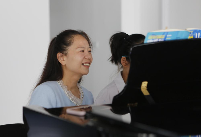见到许昌市盲童合唱团发起人忽晓时,她正带着一名小女孩练习钢琴。
