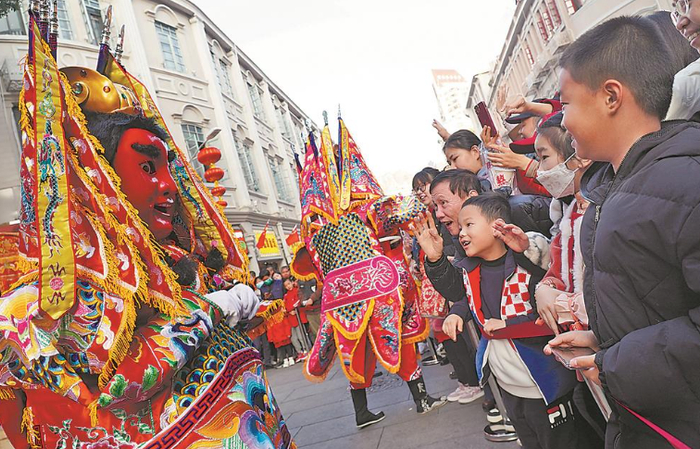 其中,中山路推出“骑楼里的中国年”,新潮音乐与非遗文化跨界联动;占地2万平方米的“小城春秋”影视小镇,移植近百年前的市井生态,让游客一秒穿越回上世纪30年代的老厦门,还能扮演“谍战”剧中人体验“飙戏”,开业以来揽客近4.3万人次;八市、百家村、沙坡尾等地同样摩肩接踵,游客们尽情感受鹭岛city walk(城市漫步)的文化气度……