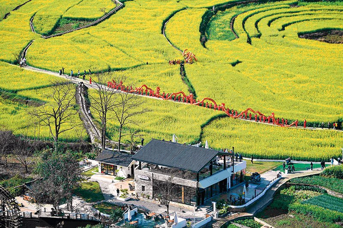在贵州省兴义市万峰林景区,盛开的油菜花和丰富的民俗表演吸引众多市民和游客前来观赏,感受田园春色(2024年2月4日摄)        刘朝富摄/本刊