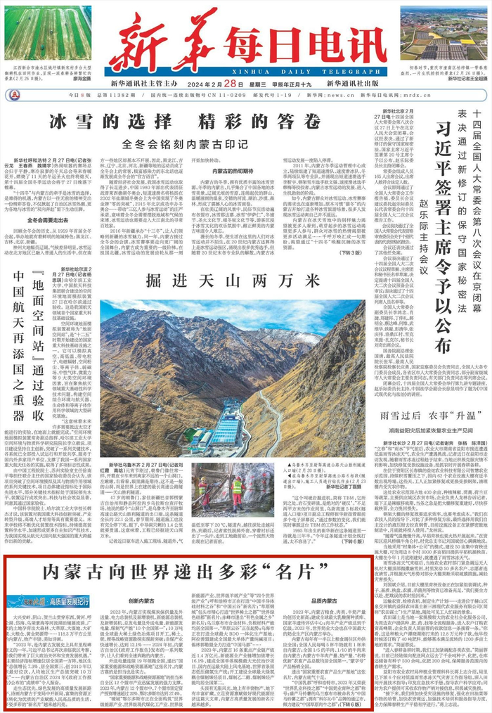 2024年2月28日,《新华每日电讯》《内蒙古日报》头版刊发题为《内蒙古向世界递出多彩“名片”》的报道,介绍了内蒙古走生态优先、绿色发展的高质量发展新路子,诗画内蒙古于变局中开新局,富集的资源正在转化为优质的产业赋能人民高品质的生活,多姿多彩的“新名片”越来越闪亮。