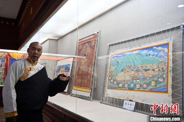 图为交巴加布展示以拉卜楞寺为主题的唐卡作品。交巴加布不仅继承了传统唐卡技艺,更在创新中展现了个人特色。他结合现代审美和绘画技巧,使作品既保留了传统的韵味,又具有鲜明的现代气息。这种独特的艺术风格使他的作品在众多唐卡中脱颖而出,成为藏族民众和艺术爱好者争相收藏的艺术珍品。九美旦增 摄