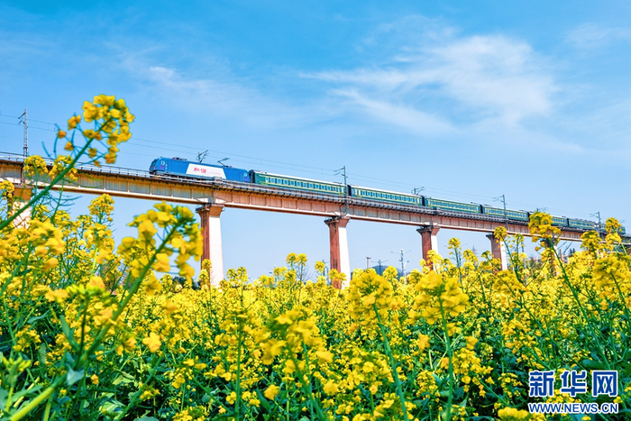 一列旅客列车穿过罗平油菜花海(摄于2月22日)。新华网发(尚建松 摄)