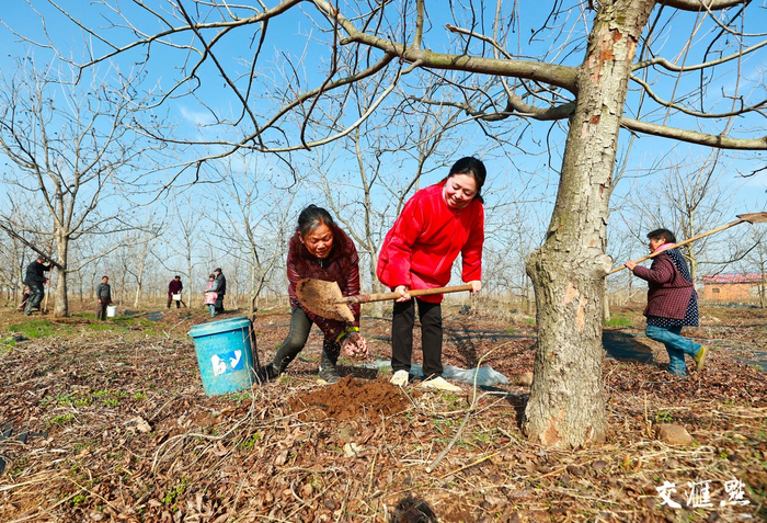 2月27日,盱眙业盛鲜果专业合作社理事长、全国人大代表李叶红正在与农户为碧根果林施肥。近年来,特色林果产业成为盱眙县农业发展新引擎,全县共发展碧根果、黄桃、板栗等共计59130亩的特色林果种植区。张照军 摄视觉江苏网供图