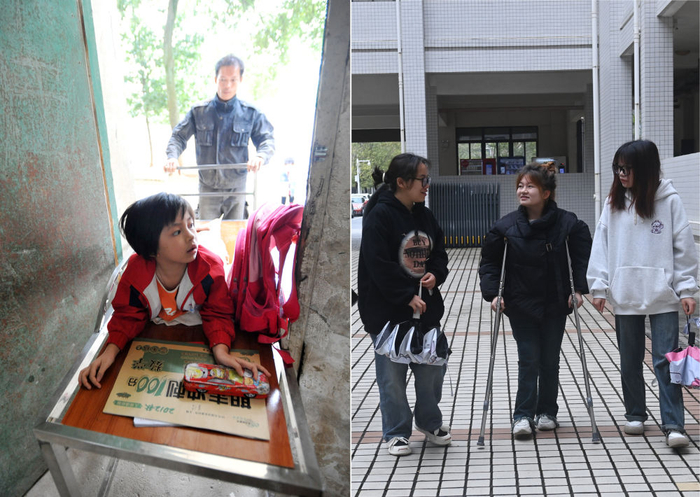↑这是一张拼版照片,左图为:在广西灵川县灵川镇的三叉尾小学,董倩的父亲董慧玲课后拉着可以移动的床将她带出教室(2012年9月13日摄)。右图为:在广西桂林师范高等专科学校,董倩(中)课后和同学走在教室外(2024年3月13日摄)。