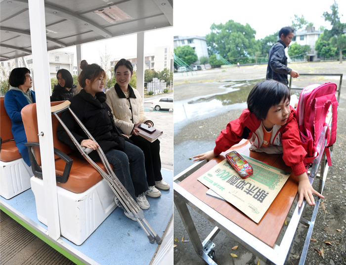 ↑这是一张拼版照片,左图为:在广西桂林师范高等专科学校,董倩(前排左一)课后坐着校园摆渡车去饭堂吃饭(2024年3月13日摄)。右图为:在广西灵川县灵川镇的三叉尾小学,董倩的父亲董慧玲课后拉着可以移动的床将她带回宿舍吃饭(2012年9月13日摄)。
