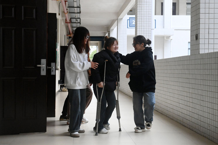 在广西桂林师范高等专科学校,同班同学搀扶着董倩(右二)走出教室(2024年3月13日摄)。