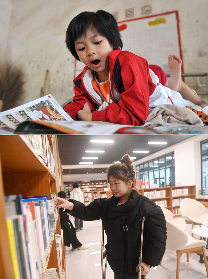 ↑这是一张拼版照片,左图为:在广西灵川县灵川镇的三叉尾小学,董倩趴在床上学习(2012年9月13日摄)。右图为:在广西桂林师范高等专科学校,董倩在图书馆看书(2024年3月13日摄)。