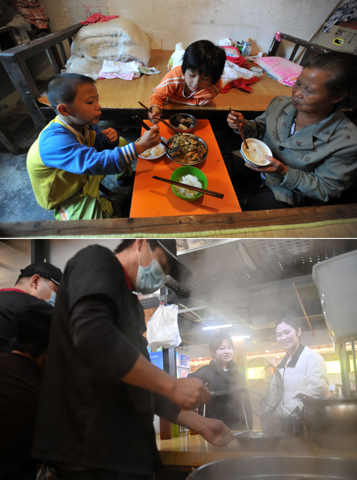 ↑这是一张拼版照片,上图为:在广西灵川县灵川镇的三叉尾小学,董倩在宿舍和奶奶一起吃午饭(2012年9月13日摄)。下图为:在广西桂林师范高等专科学校,董倩(前)在食堂用餐(2024年3月13日摄)。