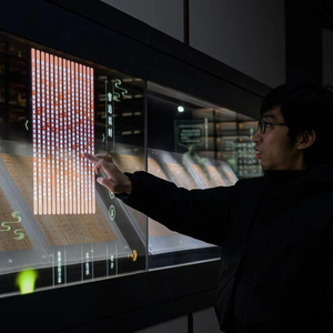 在甘肃简牍博物馆内,一枚枚简牍被放置在细细长长的玻璃管中,墨书在灯光的映衬下笼上了一层昏黄的雾。游客们沉浸在书香浓郁的展馆中,有人驻足俯身使劲靠近简牍,欲辨认细读那些文言墨字;有的人与屏幕互动,串联起不同地名的古今缘分;还有的人被装点在博物馆各处的书法之美所吸引,举起手机拍照合影。