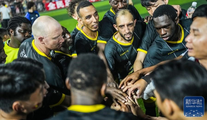 ↑贵州大学国际学生足球队球员互相加油鼓劲。