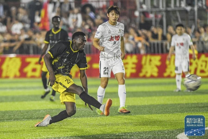 4月13日,在贵州省黔东南苗族侗族自治州榕江县“村超”足球场,贵州大学国际学生足球队对阵上饶渣渣灰江西米粉足球队。新华社记者 陶亮 摄影报道