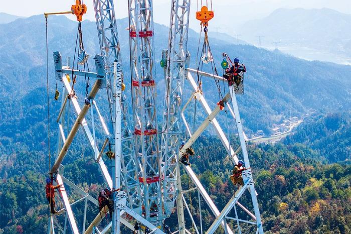“宁电入湘”特高压线路工程是我国首个沙漠、戈壁、荒漠地区风电光伏基地外送电的特高压工程。图为2024年3月12日,电力工人在湖南省益阳市安化县冷市镇进行组塔作业。 新华社记者 陈思汗/摄
