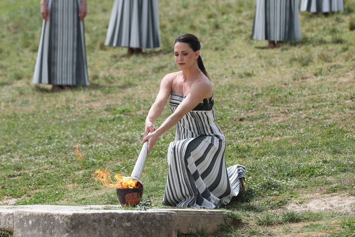 在古奥林匹亚体育场,最高女祭司将火种和象征和平的橄榄枝一同交给第一位火炬手,标志着奥林匹克火炬传递正式开启。