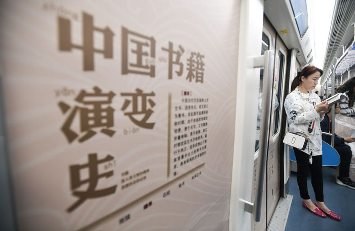 2018年4月23日,一名乘客在成都地铁1号线的“书香号”地铁列车上读书。