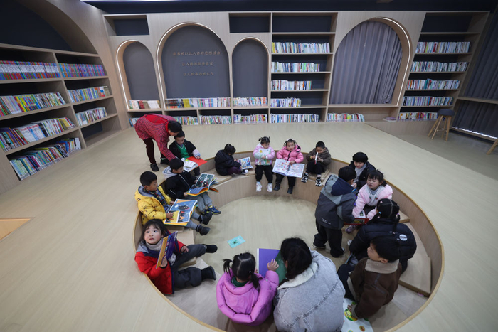 2023年12月28日,在刚刚改造完成投入使用的浙江省诸暨市姚江镇山汀村渔山书院内,孩子们在老师的陪伴下读书。该书院是由村里老屋改造而成的农家书屋。