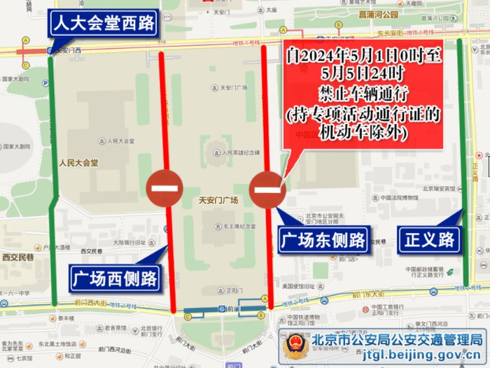 另外,交管部门透露,为保证2024年“劳动节”期间天安门广场周边道路交通安全与畅通,根据道路交通安全法律法规的有关规定,决定自2024年5月1日0时至5月5日24时,对天安门广场东侧路、天安门广场西侧路采取禁止车辆通行(持专项活动通行证的机动车除外)的临时交通管理措施,过往车辆(含公共电、汽车)可绕行正义路和人大会堂西路。