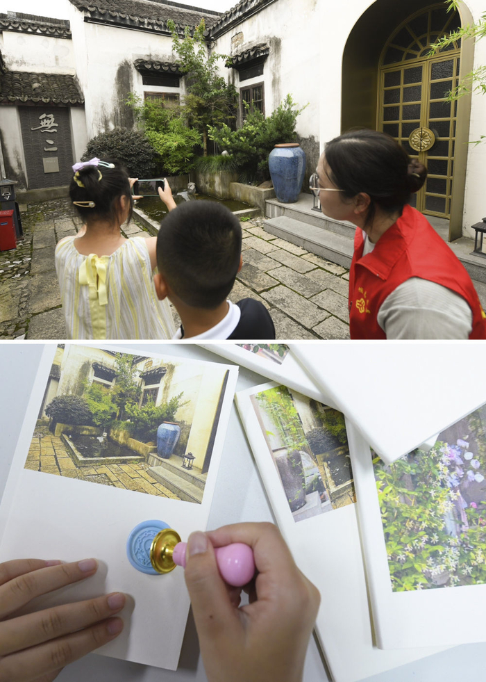 上图为2023年7月19日,参加研学活动的青少年在小西街拍照;下图为2023年7月19日,小西街一家文创店铺将照片制作成笔记本送给青少年。