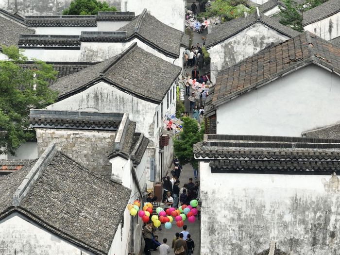 游客在小西街游览(无人机照片,4月21日摄)。